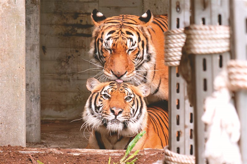 昨日是西洋情人節,台北市立動物園分享馬來虎「兩虎依偎」的溫柔畫面,祝福大家情人節快樂。動物園說,馬來虎是獨居動物,領地意識強,但賀爾蒙能讓掠食者變溫柔大貓,最近處於發情期的馬來虎Shima「判若兩虎」,但只要發情期結束,Shima就會變回霸氣女王。圖/台北市立動物園提供