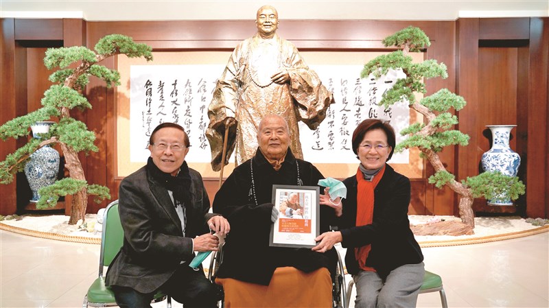 星雲大師(中)、高希均教授(左)與王力行發行人(右)都關心兩岸和平(三人2019年3月合影於佛光山)。圖/天下文化提供