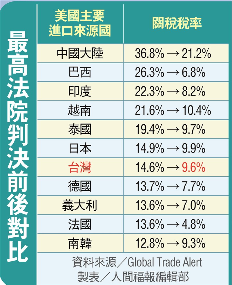 川普替代方案 加徵全球10%關稅 本報綜合外電報導 |2026.02.22 語音朗讀 153觀看次 字級 大 中 小 稅怎麼課 全球混亂 圖/法新社川普引用IEEPA課徵關稅 6:3最高院否決 圖/美國最高法院官網另闢蹊徑 稅照樣課 川普(左)對等關稅被美國最高法院認定違法後,20日痛批該裁決是「對國家的恥辱」。圖/美聯社最高法院判決前後對比 資料來源/Global Trade Alert 製表/人間福報編輯部 【本報綜合外電報導 】美國總統川普去年援引1977年《國際緊急經濟權力法》(IEEPA)對外國開徵對等關稅,聯邦最高法院20日裁定川普徵收關稅的手段不合法。他當天隨即宣布,將利用其他法源加徵為期150天的10%全球性關稅。《華爾街日報》20日報導,該裁定的消息傳出後,川普會後隨即召開記者會痛批該裁定是「對國家的恥辱」,大法官「丟臉丟到家」且「對憲法不忠」,根本是「走狗」。他還指控大法官受外國勢力干預,但並未多做詳述。他聲稱,大法官的判決錯誤,「令人深感失望。但沒關係,我們有很強大的替代方案」。川普還說,24日他發表國情咨文時,很樂意邀在該裁定中支持他關稅政策的3位大法官出席,至於反對他的6位大法官出不出席,「我根本不在乎」。老調又重彈 控台偷走晶片產業白宮20日指稱,川普當晚已根據1974年《貿易法》122條款簽署行政命令,即使已和美國達成貿易協議的國家也全部適用,即疊加10%關稅,自24日起生效。除了他,過去從未有美國總統援引該條款開徵關稅。川普在上述記者會中為其關稅政策辯護時又一次提及台灣,重彈他指控台灣多年來「偷走」美國晶片產業的老調,台灣「長期大量生產晶片,擠下我們的企業;我們的英特爾原本會是最大的企業,我第2任一開始就救了英特爾」,並誇稱如今多家在台灣的企業都已在亞利桑那州及德州等美國其他地方設廠,「因為他們不想付關稅」。被問到川普政府與其他國家在IEEPA相關關稅下談判達成的貿易協議是否仍有效,川普在該記者會中聲稱,其中許多仍有效,有些雖會失效,但仍將被其他關稅取代。根據美國聯邦政府資料,截至去年12月,美國財政部從川普援引IEEPA徵收的關稅收到1330億美元(約新台幣4.2兆元)。去年代表中小企業對川普關稅提告的律師卡提亞說,美國最高法院此一裁定對這些企業可謂大獲全勝,又一次肯定《美國憲法》最深層的價值與國會擁有的徵稅權。《華爾街日報》報導,最高法院判決並未說明這些關稅是否以及如何退還。對美國企業和整體經濟而言,這意味更多的貿易不確定性。美國聯邦最高法院20日推翻總統川普的對等關稅,美國貿易夥伴紛紛表示歡迎,不過仍有全球貿易機構提出警告,進口關稅問題仍存在諸多不確定性。美媒CNBC報導,加拿大的加美貿易部長勒布朗強調,這次裁定「強化加拿大立場,即美國援引IEEPA徵收關稅實屬不合理」。法國總統馬克宏21日也在巴黎年度農業展說,上述裁定顯示「擁有最高法院,進而擁有法治,並非壞事。在民主國家中,擁有權力以及能與之抗衡的力量,是件好事」。怕激怒白宮 台美協議料續有效韓聯社21日報導,這為南韓經濟又一次帶來不確定性;南韓政府要推翻對美投資協議有困難,核潛艦等美韓的安保合作事項也可能被延後。日本政府高層21日說,該裁定不會影響日本在美國的第一輪投資計畫。美最高法院裁定川普在未經國會批准下,無權單方面實施全球性關稅。對此,美國前代理副貿易代表柯特勒表示,任何國家想退出關稅協議都將激怒白宮,且川普也有反制措施,判斷美台等已達成的協議將續有效。 前一篇文章 30年首次 我AI外銷旺 美單月自台進口額超越大陸 下一篇文章 3月底訪陸 川普關稅失利 中美關係恐添變數 熱門新聞 01佛光山平安燈會 馬上幸福2026.02.1602大雄寶殿重啟 嶄新面貌迎新春2026.02.16032026體壇大賽連發 看點滿滿2026.02.1604吉祥長年菜 包起幸福年2026.02.1605豆香傳福氣 圓滿好兆頭2026.02.1606年味在家 團圓美滿 蓮生吉慶意 清雅見富足2026.02.1607總統登小雪山拜年 談話聚焦國防經濟2026.02.1608新春團圓不失衡:過年飲食 健康拿捏2026.02.1609光照大千祈福 佛館行春吉祥一整年2026.02.1610擁抱2026 迎接變革時代2026.02.16 訂閱電子報 台北市 天氣預報 台灣一週天氣預報 相關報導 陸AI機器人秀功夫 驚豔全球佛光山平安燈會 馬上幸福全球馬博物館巡遊 見證文明史 台美簽貿易協定 美小客車 0 關稅暖心早餐 善行19年帶動萬人 作者其他文章中日關係惡化 關西經濟承壓高市點名陸脅迫升 擬修安保3文件最清澈湖泊告急 外來藻入侵習川熱線 傳聚焦台灣軍援軍售、TikTok議題 開挖土機遊大陸 填坑修路做好事從受助到助人 小學善念循環