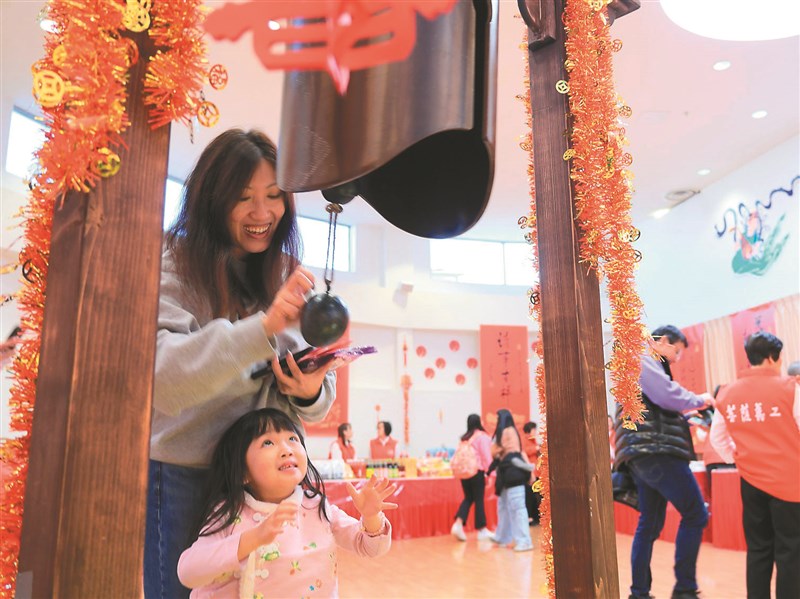 媽媽與小朋友敲平安鐘。圖/溫哥華佛光山提供