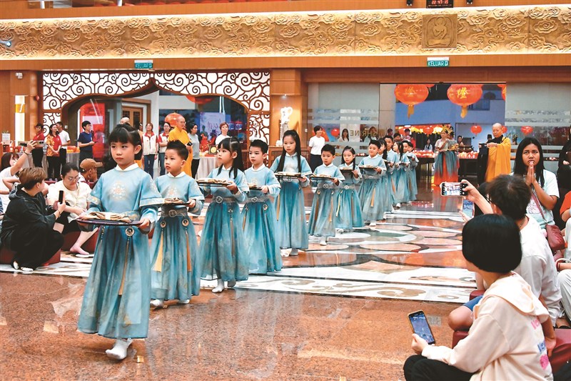 佛光山新馬寺供佛齋天,兒童獻供組穿上漢服獻供,象徵人間佛教薪火相傳。圖/人間社記者胡柏瑜