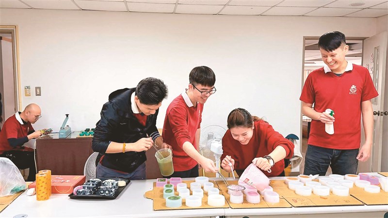 青年分工合作製作「佛光普皂」手工香皂,以行動護持道場。圖/蘭陽別院提供