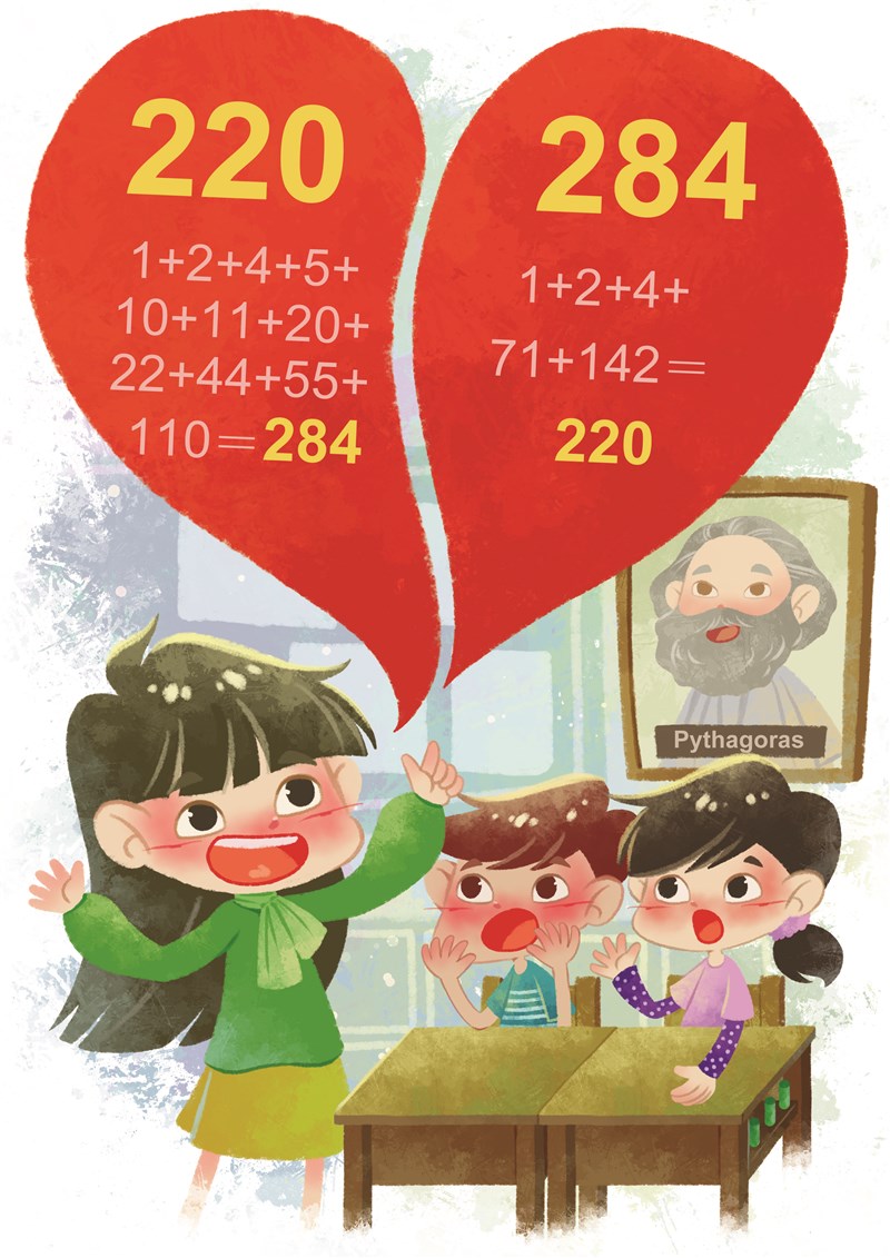 看大家一臉困惑,老師解釋說,有一種很特別的數字叫做「親和數」(amicable numbers),又稱友善數、友愛數,它們成對的組合就叫「親和數對」(amicable pairs),會彼此相親相愛。