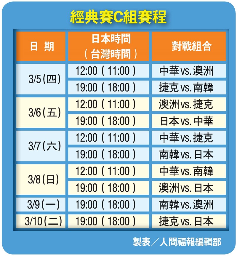 經典賽龍恩傷退 中華隊明飛日本備戰 文/記者張哲郢專題報導 |2026.02.27 語音朗讀 112觀看次 字級 大 中 小 中華隊昨晚在台北大巨蛋與日職福岡軟銀鷹隊展開交流賽,中華隊派出鄭浩均先發。圖/中央社此次中華隊依舊由陳傑憲擔任隊長,他在集訓期間帶動球隊氣氛,希望團隊可以在經典賽享受舞台、開心打球。圖/資料照片2025年2月,中華隊在台北大巨蛋拿下經典賽門票的一刻。 圖/資料照片經典賽C組賽程 製表/人間福報編輯部2013年經典賽預賽在台灣舉行,台灣球迷熱情應援加持。圖/資料照片 文/記者張哲郢專題報導從1月15日成軍展開集訓,WBC經典賽中華隊即將於明天啟程飛往日本宮崎,為3月5日開打的世界棒球經典賽做最後調整,迎接這項對台灣來說別具意義的棒球盛會,本周運動曼陀羅也將掌握中華隊前進邁阿密的重點分析。對中華隊來說,這是2024年世界12強棒球賽奪冠後,所迎接首場棒球一級國際賽,12強中華隊空前摘下一級賽事冠軍,將會是首度在取得最高榮耀後再次出征,各項細節也不容馬虎。從1月中展開集訓,中華隊透過比先前更完整的訓練、情蒐布局,期望屆時能在經典賽調整到最佳狀態,試圖在有日本、南韓、澳洲等強敵環伺的C組,能夠爭取分組前2名晉級8強,前進美國邁阿密。曾豪駒:選狀況最好選手遞補不過在出發前,中華隊傳來至今最大壞消息,混血戰力「龍仔」龍恩(Jonathon Long)因傷勢復原不如預期,昨天正式宣布退出中華隊,作為陣中年輕且天花板最高的重砲,無疑對中華隊戰力是一大打擊。龍恩對此表示十分惋惜,沒辦法披上中華隊戰袍;中華職棒會長蔡其昌說明,一切都以龍恩健康為主,且龍恩未來還有很長的職業生涯,祝福龍恩可以在美國發展順利,特別今年有機會升上大聯盟,可以留下好成績。總教練曾豪駒坦言,缺少龍恩一定會有影響,從攻擊、守備、棒次安排各方面都是,遞補人選會從有參加集訓球員中,選擇狀況最好的人。從最初「卡仔」卡洛爾(Corbin Carroll)婉拒參加到龍恩傷退,中華隊鎖定補強的三大混血戰力,「費仔」費爾柴德(Stuart Fairchild)成為唯一報到球員,今天他也將跟球隊會合,準備與球迷們相見歡。2日熱身賽 5日正式燃戰火中華隊有別於以往備戰,從年前進入實戰階段後,包含先前跟南韓職棒培證英雄交手、昨天面對日本職棒福岡軟銀鷹、今天還要對決北海道日本火腿鬥士,實戰環節有更多不同風格隊伍,能夠藉此累積經驗。蔡其昌認為,若是自己人交流大家都很熟悉,效果沒那麼好,能跟優秀的隊伍交流,對中華隊強度會比較有幫助。曾總說:「藉由比賽,我們該演練的戰術就會演練,大家把集訓至今的成果運用在比賽上。」明天中華隊即將啟程飛往日本宮崎,3月2、3日官辦熱身賽會再對戰歐力士猛牛、軟銀,接著飛往東京後,4日官方練習日,5日由台澳戰正式點燃今年經典賽戰火。首戰拒絕先丟分 中華隊愈有利■3月5日中華隊迎戰澳洲,這場不單單是今年世界棒球經典賽C組首戰,更是整個賽會首場比賽,為期兩周的世界棒球熱就從台澳戰揭開序幕,過去中華隊也曾在首戰遇過澳洲,能否打出開門紅,是中華隊建立士氣的重要之戰。以過去中華隊在經典賽的狀況來看,首戰能否贏球便會影響最後晉級結果,先前5屆賽會中華隊只有2013年能拿下首戰勝利,也是只有2013年中華隊能夠從小組賽突圍,當時小組賽首戰對手正是澳洲。其他4屆中華隊首戰吞敗,都有個共通點,無論是前兩屆交手南韓,或是2017年遇上黑馬以色列、上屆碰上巴拿馬,這4場敗仗都是中華隊先掉分,一旦在經典賽首戰率先失分,中華隊至今還沒贏過。由此可見擔任台澳戰先發任務的投手角色十分關鍵,這幾年中華隊已經證明自家打線有辦法跟世界競爭,經過上屆經典賽教訓,可以愈早上緊發條,對中華隊會愈有利。近年國際賽只要碰上澳洲,中華隊都會是贏球那方,包含世界12強棒球賽以11:3大勝,論投打實力經典賽中華隊陣容更上層樓,但澳洲打線上屆經典賽曾擊潰南韓,因此中華隊首戰整體投手群穩定,比起打擊更重要。總教練曾豪駒表示,透過這段時間在實戰的演練,正賽前會讓中華隊調整到最佳狀態。海外參戰至今僅1勝 適應球場很關鍵■有別於上屆世界棒球經典賽在主場舉行,中華隊今年經典賽從預賽到未來複、決賽,都會在海外球場比賽,但過去經典賽中華隊只在海外球場拿過1勝,能否適應異地比賽的狀況值得觀察。包含第1、2、4屆經典賽,中華隊在小組賽都在海外參戰,加上2013年主場取得分組第1晉級後,飛往東京巨蛋參加複賽,賽史中華隊在海外比賽正好10場,成績僅1勝9敗,唯一1勝還得追溯至首屆面對實力較差的中國大陸,中華隊才能取勝。像2013、2023年預賽都在台灣舉行,中華隊靠著台灣球迷熱情應援加持,加上熟悉自家場地,主場成績來到4勝3敗,跟客場差異甚大。中華隊想要晉級,就必須得克服先前在國外球場表現不佳的問題,優勢是這批選手中有不少人參加世界12強棒球賽,也有在交流性質的亞洲職棒冠軍爭霸賽出場過,對東京巨蛋並不陌生,加上現在有台北大巨蛋,期望中華隊能夠在轉換球場時加速適應。再來是今年經典賽中華隊多在午場比賽亮相,除3月6日台日大戰是打晚上,其餘3場預賽都是打中午,這跟平時職棒聯盟比賽作息相反。總教練曾豪駒指出,球隊都有相對因應的安排,從集訓開始,都會讓大家早點休息、早點展開訓練,好適應午場的比賽生理時鐘。突破日韓