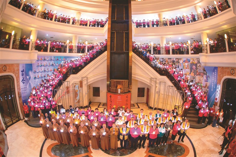 佛光山惠中寺15日舉行「舊址圓滿,願行不遷」熄燈儀式,象徵著在過去20載歲月中,舊址弘法使命的功德圓滿。圖為覺居法師(前排左8)帶領全體法師與所有佛光人於一、二、三樓大合照。圖/人間社記者吳雨彤