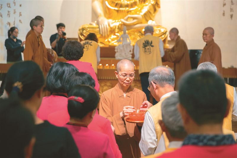 「點燈與傳心」儀式,由覺居法師(中)手上主燈,傳燈給幹部們進行獻燈。圖/人間社記者吳雨彤