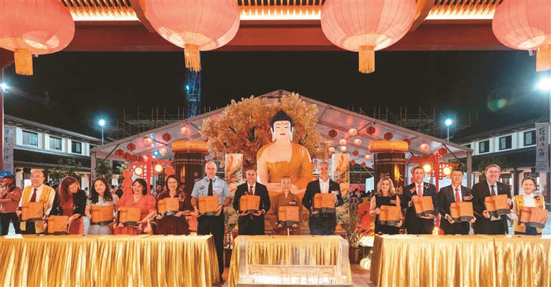 中天寺住持滿望法師(右7)邀請昆州多元文化事務副部長Hermann Vorster(右6)、聯邦財政部長Jim Chalmers(右8)等歷年護持中天寺的各界貴賓,於16日除夕夜舉辦「為新建大雄寶殿簽瓦」儀式。圖/人間社記者Jono