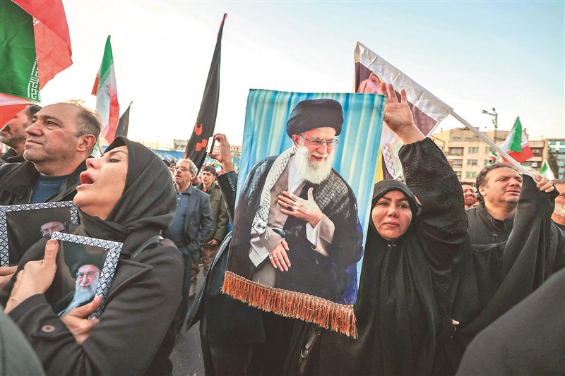 伊朗民眾1日聚集在德黑蘭街頭與廣場,悼念在空襲中遇襲身亡的最高領袖哈米尼。圖/法新社