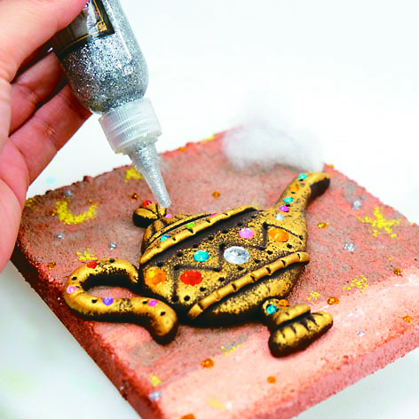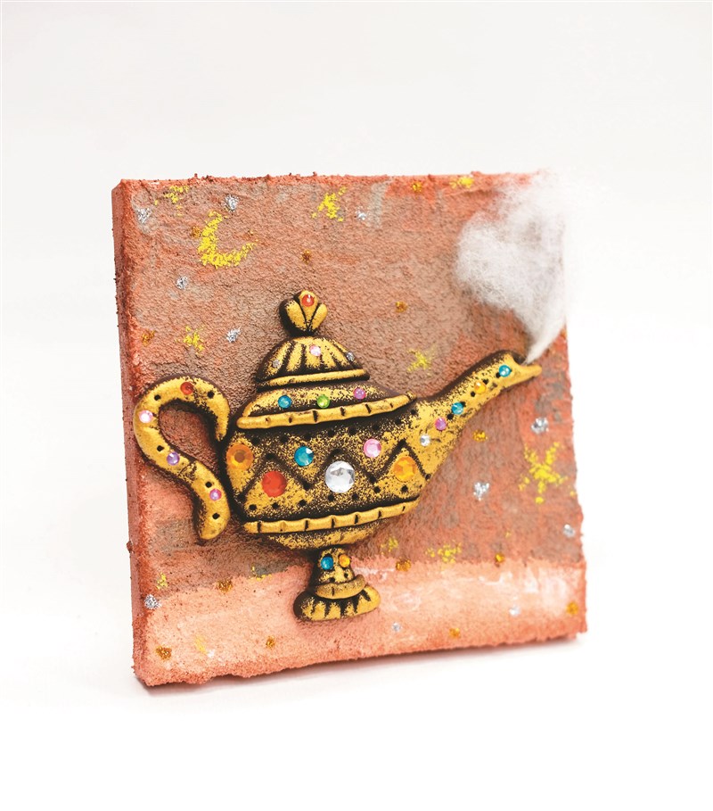 【創意黏土教室】阿拉丁神燈捏塑創作 文/Max |2026.03.02 語音朗讀 39觀看次 字級 大 中 小 製作步驟 8將寶石貼紙黏貼在神燈上,要注意大小與排列位置。圖/Max製作步驟 4捏塑把手、燈蓋、底座等細節。圖/Max製作步驟 3以黑色系黏土捏塑神燈的壺身與壺嘴,以浮雕方式呈現。圖/Max製作步驟 6使用工具與泥條,在神燈表面加入裝飾浮雕。凹凸起伏愈豐富,效果愈立體。圖/Max製作步驟 11使用金蔥膠水在畫面上點綴,加深視覺效果。完成!阿拉丁神燈創作誕生了!圖/Max製作步驟 5將完成的部件黏貼到已經打好底的畫布上。若畫布尚未乾燥,要小心避免沾到顏料。圖/Max製作步驟 10可以使用蠟筆在背景中增加色彩,讓畫面更有層次。圖/Max製作步驟 9用棉花搓揉出一道輕煙,以白膠黏在壺嘴處,呈現魔法緩緩飄出的效果。圖/Max製作步驟 2用刮刀將泥土色壓克力顏料、石英砂與白膠攪拌均勻,在畫布上打底,做出泥土般的砂礫質感。圖/Max製作步驟 1準備畫布、石英砂、咖啡色金屬壓克力顏料、海綿、寶石貼紙、白膠、棉花等材料。圖/Max製作步驟 圖/Max製作步驟 7用海綿沾取金色顏料,輕輕拍在神燈表面,做出仿古金屬效果。圖/Max 文/Max說到童話故事,大家會想到什麼呢?是東方的精怪神話、歐洲大陸王子與公主的華麗冒險,還是神祕中東世界裡那片我們不熟悉的沙漠?中東阿拉伯的童話故事裡,往往籠罩在一層神祕、熾熱且詩意的氛圍之中,彷彿夜風裡夾著沙粒與香料的氣息。閱讀這樣的故事,好似遠方會傳來一陣駱駝商隊的鈴聲在空氣裡迴盪。中東的童話故事多半設定在古代或中世紀的阿拉伯世界,現實與奇幻自然交融,白天是炙熱的沙海,夜晚則是魔法甦醒的時刻。城市裡有華麗的宮殿、掛著銅燈的迷宮街道,以及夕陽下泛著金光的圓頂。這樣的故事背景宛如一篇傳奇詩篇,每個場景都像電影鏡頭般唯美。想要創作這樣的主題,選對材料很重要,材料如果掌握得精準,作品就能栩栩如生。這次的單元元素包含沙漠、寶石、金屬等意象,我們可以透過複合媒材的配合來傳達。現在,準備好材料,我們一起發揮想像力,讓輕黏土變身成美麗的阿拉丁神燈! 前一篇文章 【徵文啟事】 下一篇文章 【創作花園】家鄉的驕傲 熱門新聞 01【詩】啤酒與冰淇淋 2026.02.2702發現世界最早花椒?2026.02.2503【遇見荷】眠夢風吹雪2026.02.2504台北道場行春 蔣萬安為市民祈福2026.02.2605西來寺賀新春 平安燈會湧人潮2026.02.2406全台櫻花綻放 粉紅花海來襲2026.02.2407好苗子獲頒獎學金 新年新希望2026.02.2508大馬首相署開齋晚宴 佛光山受邀出席 2026.02.2509新馬寺供佛齋天 重現千年佛教盛況2026.02.2510惠中寺舊址熄燈 新址再啟弘法扉頁2026.02.27 訂閱電子報 台北市 天氣預報 台灣一週天氣預報 相關報導 【快樂塗鴉簿】螞蟻生態【快樂塗鴉簿】湖光山色【唐詩小學堂】李頎〈古從軍行〉【快樂塗鴉簿】向日葵【新詩大解密】陳千武〈根〉【快樂塗鴉簿】水牛兄弟 作者其他文章【創意黏土教室】企鵝輕黏土創作【創意黏土教室】古希臘瓶畫黏土創作