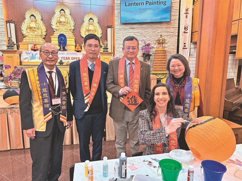 伊州眾議員Anne Stava (右2)參與彩繪燈籠,與台北經濟文化辦事處類延峰處長(左3)、華僑文教中心主任雷棋(左2)合影。圖/芝加哥禪淨中心提供