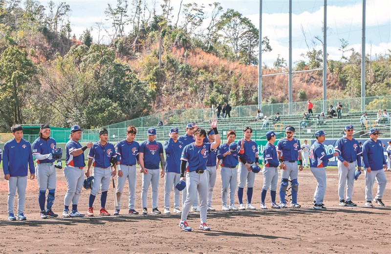 中華隊昨在世界棒球經典賽唯一一場官辦熱身賽面對軟銀二軍,以5:1獲勝,隊長陳傑憲賽後(前)率全隊致謝。