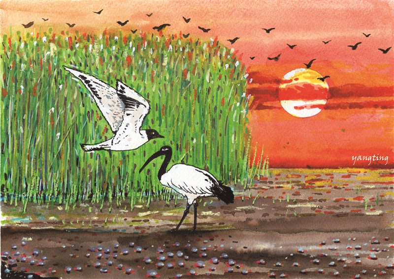 詩的第一節,詩人將大甲溪的沖積想像成「偷偷刮下」南湖大山的山頭,化作腳下肥沃的黑泥灘,這個比喻讓地質變動變得既生動又調皮。這片黑泥地被稱為「黑金」,象徵著土地最厚實、最能孕育萬物的價值。隨後,詩人運用了巧妙的對稱:左邊是如徐志摩般瀟灑「揮揮袖」的雲林莞草,右邊則是黑嘴鷗與埃及聖在「撲撲翅」。最俏皮的是,詩人將鳥類的足跡形容成在泥地上「蓋滿印章」,瞬間將濕地的生態寫活了,彷彿一群藝術家正在集體創作。