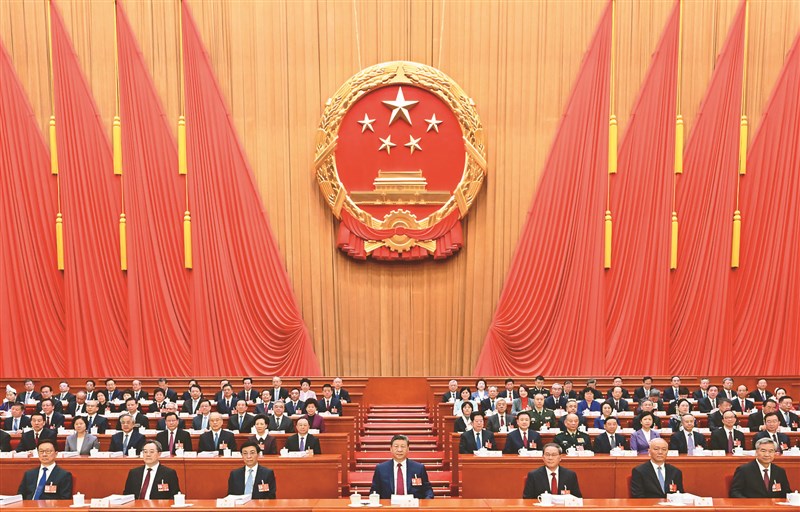 中國大陸全國人大會議5日在北京人民大會堂開幕。國家領導人習近平(中)、李強(右3)、王滬寧(左3)、蔡奇(右2)、丁薛祥(左2)、李希(右1)、韓正(左1)等出席大會。圖/新華社