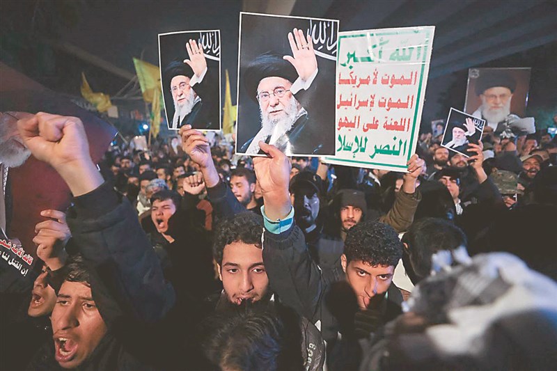 伊朗最高領袖哈米尼日前身亡,伊拉克的伊斯蘭教什葉派教士5日在巴格達的美國駐伊拉克大使館外,舉他的肖像等標語抗議。 圖/法新社