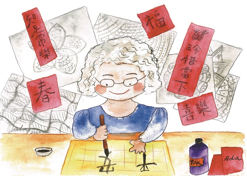 雖然總記不住纏繞畫步驟或線條總對不齊,但她還是努力不懈的完成一張又一張美麗的作品。上書法課時,她最喜歡寫「知足常樂、珍惜當下、平安幸福」等等,這些充滿正能量的字詞激勵她前行。