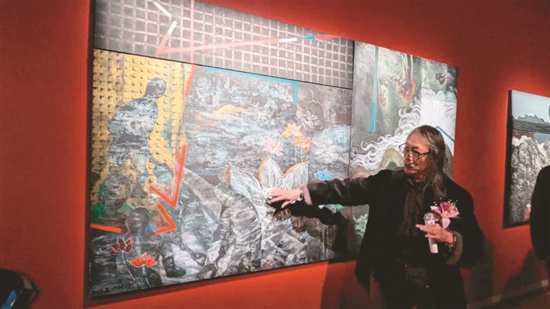 「立命.玄武 洪根深八十水墨創作展」7日開幕,洪根深為眾人導覽。圖/中央社