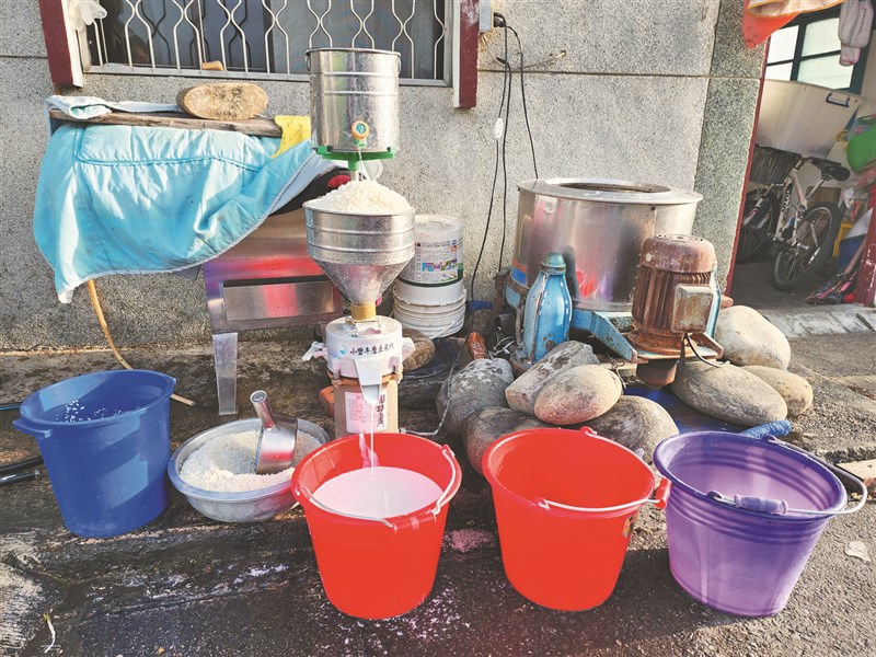看到磨米機了吧。它上方的白米堆成一座小山;機器低鳴運轉,乳白色的米漿從磨米機下方汩汩流出,緩緩注入桶中。這樣的畫面,您心中是否已有答案?是的,製作各式米製糕粿,正是從這一道磨出米漿的工序開始。
