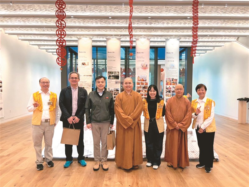 駐舊金山台北經濟文化辦事處處長伍志翔(左3)參訪三寶寺,住持如揚法師(中)帶領佛光幹部接待導覽。圖/人間社記者林郁慈