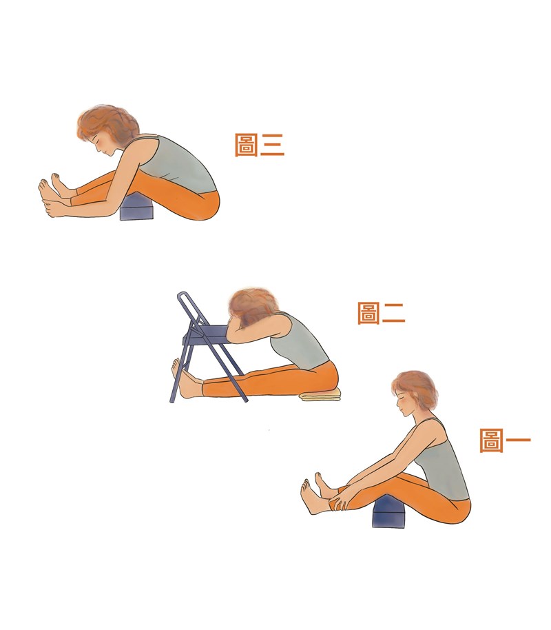 一、膝蓋下方放置瑜伽磚或高枕,腳趾向上,骨盆保持中立(圖一)。吸氣,腰背自然挺直;吐氣,上半身向前傾,重點在於腹部緩緩貼近大腿,避免彎腰駝背與垂頭。