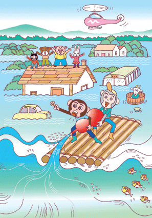 他們立刻帶著神奇葫蘆去找山羊村長,山羊村長趕緊聯絡「海鷗救難部隊」,用直升機載他們到災區。到了災區,果然是一片「汪洋大海」,很多房子都只露出屋頂,車子也泡在水裡不能動。