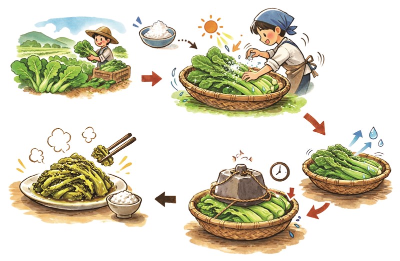 百變芥菜 文/Mei |2026.03.13 語音朗讀 42觀看次 字級 大 中 小 圖/小格圖/小格圖/小格 文/Mei農曆新年甫過,那熱鬧的圍爐節慶氛圍,想必仍於我們的心中洋溢著……象徵富貴吉祥的各式年菜,一年一度再次上演於餐桌:步步高升、長壽延年、連年有餘……等,各有其相對應的菜餚。無論是意猶未盡,還是望之卻步,你一定忘不了那其中一道寓意為「長年菜」的芥菜。長而厚實的葉片,是「長久吉祥」;苦而後甘的滋味,是「苦盡甘來」。吃進去的,是團圓時的道道年菜;留下來的,是打拚後的辛勤觸動。芥菜,有著人們說不出口的深摯情感。新春佳餚 功能百變芥菜有什麼百變的功力呢?它又有什麼發酵祕密藏於其中?屬性溫和的芥菜,在麻油與薑的交融之下,替人們褪去了寒冷的冬意。其味辛、苦,是冬春時節,利氣入肺的溫補良食。燉得軟爛的長年菜,更提供牙口不好的長輩們一道美味佳餚。在早期物資貧乏的農村社會裡,保存食物是家家戶戶心照不宣的默契,「芥菜」便是客家人最具代表性的特色保存食。量產的芥菜,以鹽的滲透壓原理,搭配少量的陽光,與搓揉的力道,脫出芥菜高含量的水分,以重物加壓數日,翠綠鹹香的「雪裡紅」於是誕生!芥菜發酵 促進開胃若持續將醃漬的芥菜壓實入缸,除了析出更多水分,此時產生的乳酸菌,亦開始活躍其中,而厭氧發酵是關鍵所在,透過酶化反應,將芥菜中的醣類轉化成具有獨特酸香的乳酸;而蛋白質則分解成具有鮮味的胺基酸。乳酸菌的存在,不僅抑制了其他害菌,同時也促進益生菌的生長,這是發酵芥菜,那開胃下飯、幫助消化的機密。一個月的等待,「酸菜」終於光榮登場,酸香滋味,可謂菜如其名。若是論及更長久的保存,則非「福菜(覆菜)」與「梅乾菜」莫屬。將酸菜緊密的填充壓實,以隔絕空氣搭配鹽漬的方式,填入開口較小的瓶中,來抑制微生物的生長。同樣的,在時間淬煉下,造就了風味較溫潤的福菜。裝填入瓶的酸菜會將瓶子倒覆,以延長保存,故名「覆菜」;取其福來運轉諧音,故名「福菜」。而將酸菜洗淨曝晒至完全乾燥,即成風味最為濃郁的梅乾菜,若製作、保存得宜,陳年梅乾菜的風味更是得來不易的珍饈!在鹽與時間的催化下,多種風味各異的發酵食將陸續誕生!隨著芥菜內部的組織與細胞壁被破壞或軟化的程度不同,淡雅、濃郁、清香、沉穩……百變芥菜多層次的滋味各有其擁護者。對你而言,什麼是令人懷念的家鄉回憶?有人屬意故鄉的風與土、有人感謝父親為他留的一盞夜燈、有人垂涎的是巷口那攤乾麵、更有的人回味母親最具特色的那道菜餚。也許對大多數人來說,「芥菜」所發展出的各式迷人風情,與惜福、愛物的精神,才是什麼都無法無法取代的懷念家鄉味。 前一篇文章 尿酸高 傷腎訊號 下一篇文章 搞懂發酵、發霉、 腐敗差在哪裡! 熱門新聞 01動物吃發酵花果 竟倒成一片2026.03.0802澳洲鸚鵡 吃芒果 成落果2026.03.0803台北燈節佛光山燈區 為民眾點亮光明希望2026.03.0704美伊續戰 桶裝瓦斯恐飆破千元2026.03.0705星雲大師全集⑳【佛教管理學③】弘法系列人事篇-人事管理法⑨2026.03.0706美擬推AI晶片許可制 掌全球算力 2026.03.0707東禪寺全民閱讀書展 書券贈偏鄉90校2026.03.0708伊朗稱絕不投降 允暫停攻擊鄰國2026.03.0809多倫多佛青祥獅賀歲 加國長者公寓送暖2026.03.0710海習飛佛光緣 一日禪修2026.03.07 訂閱電子報 台北市 天氣預報 台灣一週天氣預報 相關報導 搞懂發酵、發霉、 腐敗差在哪裡!尿酸高 傷腎訊號世界腎臟日回收乾淨塑膠袋 正確輕鬆有撇步可分離塑膠鳥類羽色多變化