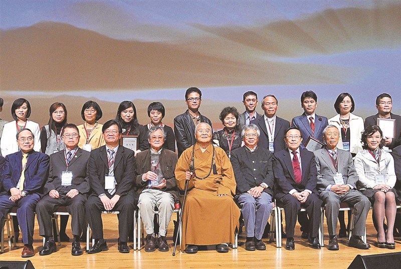「第3屆全球華文文學星雲獎」與「第5屆星雲真善美新聞傳播獎」聯合頒獎典禮,作者(左三)與星雲大師、委員、評審及得獎人合影。