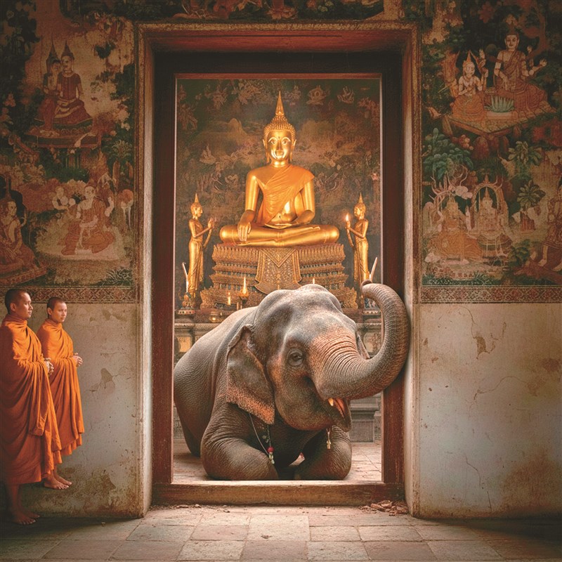 而在泰國有一隻身軀龐大的大象,牠會跑到一間屋子裡面去禮佛。那間屋子的門非常狹小,牠必須跪著,把身體緊縮著爬進去。進去之後,因為太高大站不起來,牠就一路跪著爬到佛像前面,用象鼻對著佛像,彷彿在禮佛一樣,還會發出一種聲音,讓人覺得牠好像在念佛。禮拜完之後,牠又用盡全身力氣,跪著慢慢爬出那道門。當牠走出來時,身形高大壯碩,比那道門大多了。