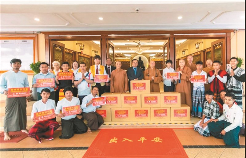 佛光山於緬甸強震後,多次送出物資協助災區民眾恢復生活。圖為緬甸駐馬大使吳昂索溫(後排右9)在心保和尚(後排右8)、覺誠法師(後排右6)和蕭依釗(後排右7)等人見證下,接收物資。圖/資料照片
