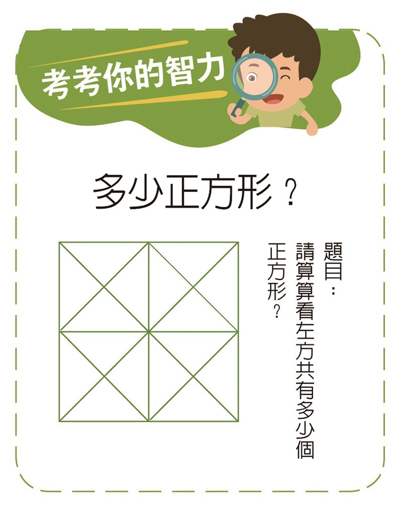 【考考你的智力】 |2026.03.16 語音朗讀 39觀看次 字級 大 中 小 多少正方形? 題目: 請算算看左方共有多少個正方形? 多少正方形?題目:請算算看左方共有多少個正方形?解答:10個 前一篇文章 指猴Hira收集什麼? 下一篇文章 熱門新聞 01多元計程車機場載客 高雄先試辦2026.03.1102台灣燈會 法國「飛天白馬秀」演到14日2026.03.1103中東戰火 國際油價飆破 100 美元2026.03.1004記星雲大師二三事2026.03.1005【閱讀生活】明天會更好2026.03.1006佛光山花蓮光復佛光緣 灑淨啟用2026.03.1007【小書法家】攏馬歡喜2026.03.1008多晒太陽多活動 長輩不失眠2026.03.1009星雲大師全集【傳記】 百年佛緣─社緣篇 讓體育在佛教生根 3 - 12026.03.1010千名愛書人 共讀中國佛教文學史2026.03.10 訂閱電子報 台北市 天氣預報 台灣一週天氣預報 相關報導 指猴Hira收集什麼?動物也有收集癖搞懂發酵、發霉、 腐敗差在哪裡!百變芥菜 尿酸高 傷腎訊號世界腎臟日