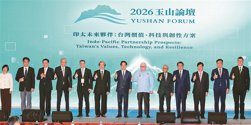 台灣亞洲交流基金會與外交部共同舉辦的「2026年玉山論壇」昨舉行開幕式,台亞會董事長蕭新煌(左6)邀請賴清德總統(中)、波蘭前總統華勒沙(右6)、斐濟前總理喬馬漢(右5)、日本「日華議員懇談會」會長古屋圭司(左4)為大會致詞。圖/許正宏