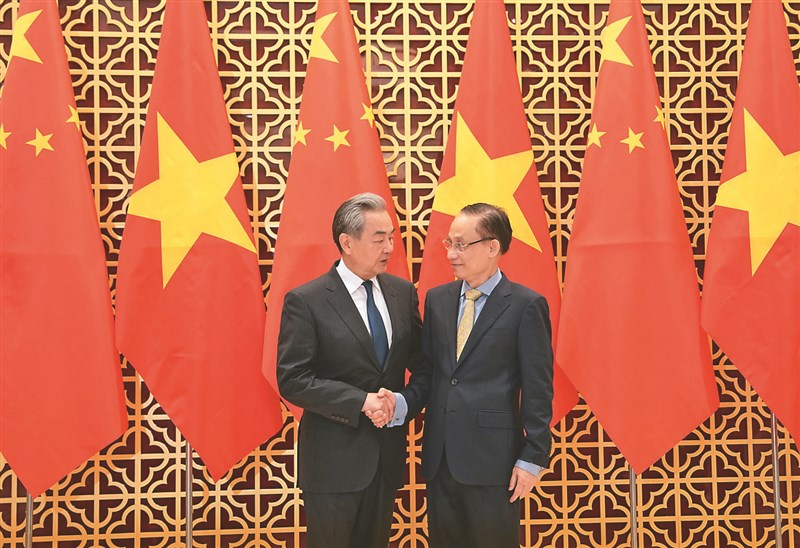 中國大陸外交部長王毅(左)15日在越南河內會見越南外交部長黎懷忠。圖/新華社