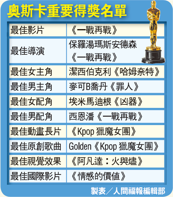 而《一戰再戰》成為本屆最大贏家,一舉拿下最佳影片、最佳導演等共6項大獎,成績亮眼。動畫類獎項方面,《Kpop 獵魔女團》奪得最佳動畫長片;最佳紀錄片獎則由《無名小卒對抗普亭》抱回,表揚其對時事議題的深刻呈現。