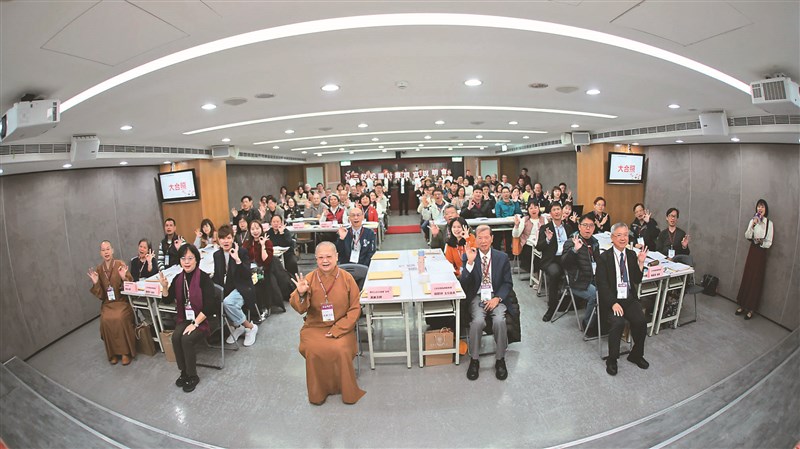 「2026三好校園計畫撰寫說明會」13日於佛光山台北道場召開,滿謙法師(前排左3)、覺多法師(前排左1)與楊朝祥(前排右2),和校長、主任、教師等人合影。圖/公益信託星雲大師教育基金提供