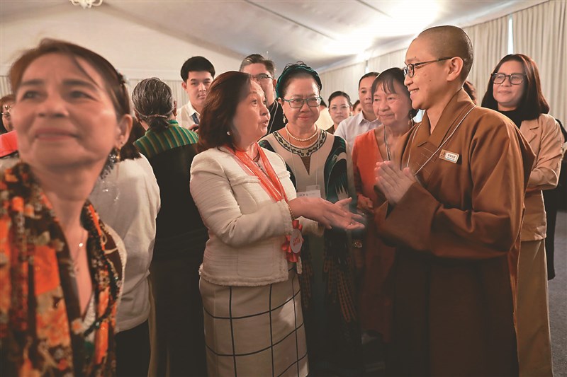 妙淨法師與Gloria Macapagal-Arroyo前總統(前排左)交談,分享星雲大師與其先父Diosdado的殊勝因緣。圖/佛光山萬年寺提供