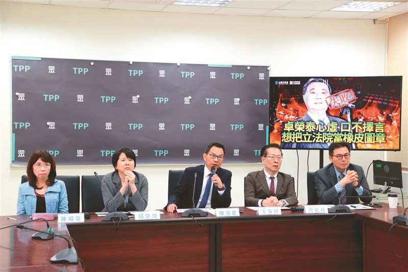 民眾黨立法院黨團昨在總召陳清龍(中)主持下召開記者會,針對中選會人事同意權案,批評行政院長卓榮泰詆毀在野黨。圖/葉信菉