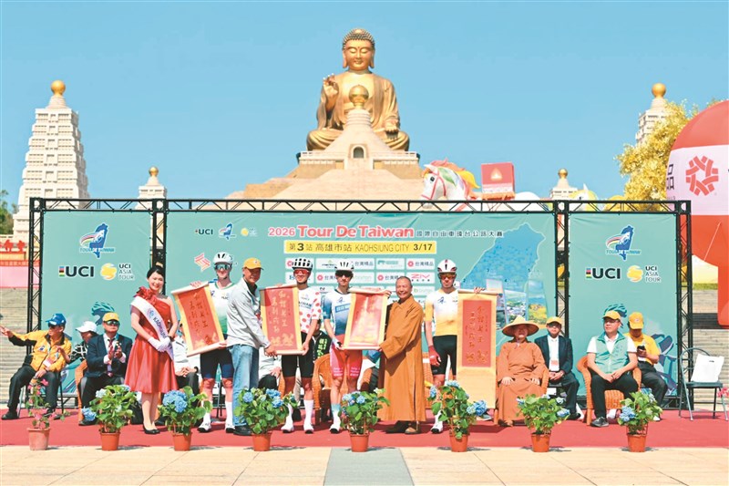 【記者王淑芬大樹報導】國際自由車總會UCI登錄一級賽事「2026國際自由車環台公路大賽」17日進入第3站賽程,於佛光山佛陀紀念館鳴笛出發。來自全球34國、177名精英職業選手齊聚,在佛光山常務副住持慧傳法師、佛陀紀念館館長如常法師及高雄市政府副祕書長張家興等人的祝福下,伴隨現場法師與民眾的加油聲,展開激烈競逐。