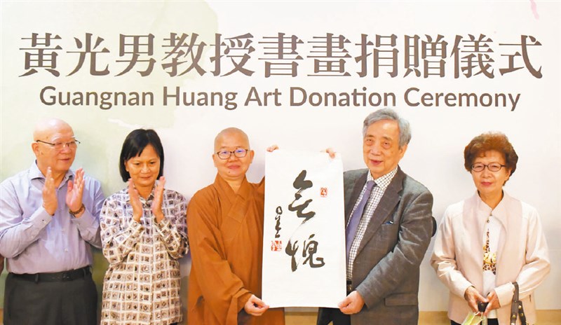 2022年3月,作者(右二)捐贈七幅畫作給佛陀紀念館典藏,星雲大師致贈書法墨寶〈無愧〉,由館長如常法師(左三)代表贈予。圖/資料照片
