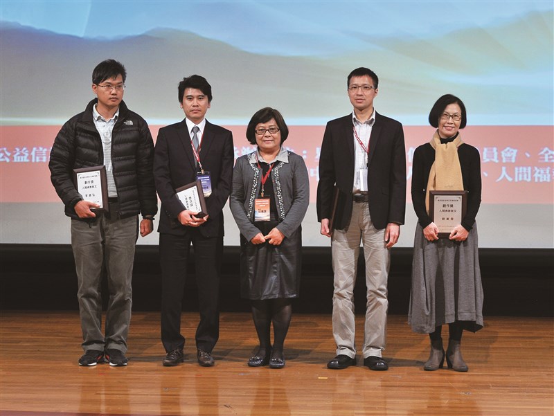 2014年12月第四屆全球華文文學星雲獎頒獎典禮,作者(中) 擔任評議委員暨頒獎人,並與人間佛教散文獎得獎人合影。圖/資料照片