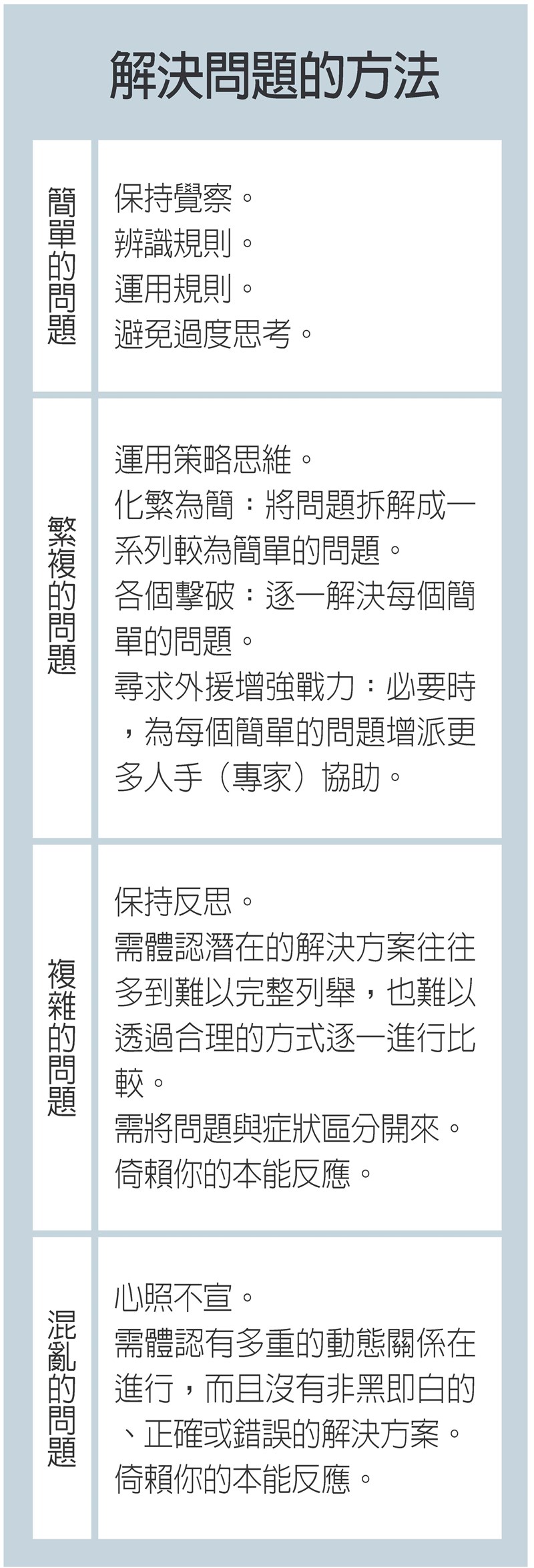 複雜問題和混亂問題可被拆解成實際上是簡單或「只是」比較繁複的小部分。當然,我們可以有系統地獲取數據並分析這些部分,但真正讓這些問題複雜或混亂的原因,在於其中的關鍵部分是不可知的,因此我們必須依靠並運用我們的本能反應。
