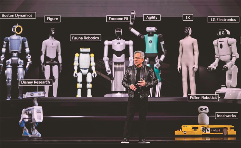 川普政府推出AI發展的單一國家政策框架,避免各州自行規定造成混亂。圖為輝達執行長黃仁勳在年會上展示各種AI機器人。圖/美聯社