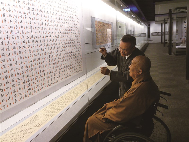 2014年元月,作者受邀在佛陀紀念館舉辦「百花春到為誰開.李蕭錕禪畫展」,大師於開幕次日來參觀,作者為大師一 一導覽說明。圖/資料照片