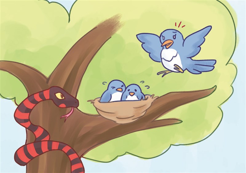 有一天,母喜鵲在這個巢的上方來回不斷的飛來飛去,不停的發出悲傷且急切的鳴叫。接下來,成群的喜鵲聽到母喜鵲的悲鳴,全都聞聲趕過來,聚集在這棵古樹上。原來是有條赤練蛇正對小喜鵲虎視耽耽。