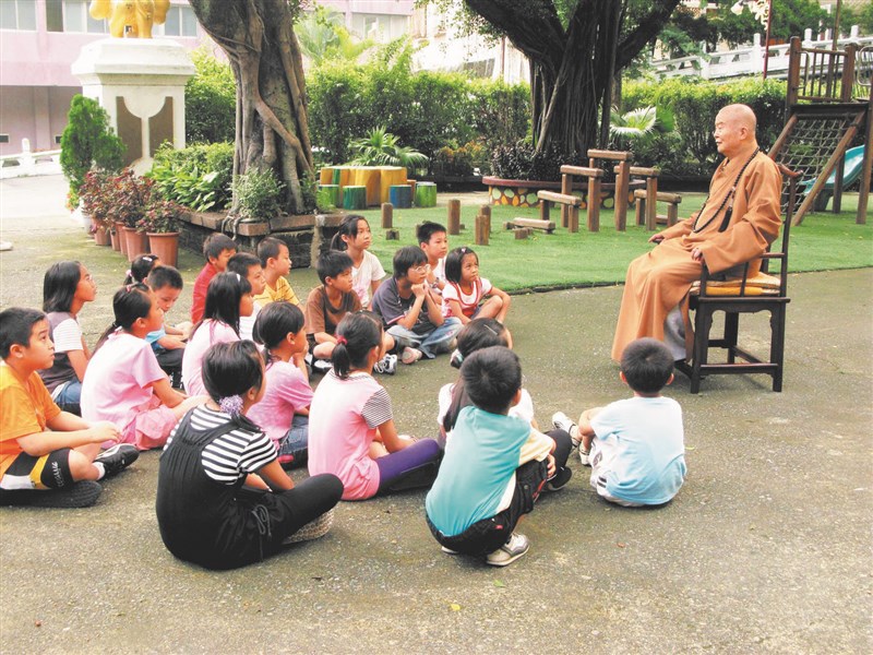星雲大師成立大慈育幼院,在他的心中,這裡的每個孩子都是「佛光山的王子與公主」。圖為大師為院童說故事。圖/大慈育幼院提供