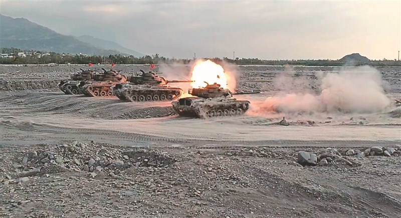 陸軍花東防衛司令部第二作戰區,昨清晨在台東太麻里溪出海口實施「正義操演」火砲實彈射擊,M60A3戰車砲、155公厘榴彈砲,以及120、81迫擊砲接連開火,火光與砲煙交織,場面震撼。操演全程可見美方技術協作人員在場觀看,提供意見。圖/尤聰光