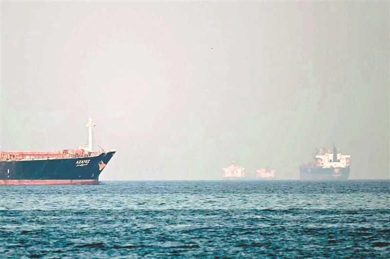 伊朗告訴聯合國,「非敵對」船隻可通行荷莫茲海峽。圖為2月25日阿聯北部外海,可見幾艘貨船和油輪在荷莫茲海峽上。圖/法新社