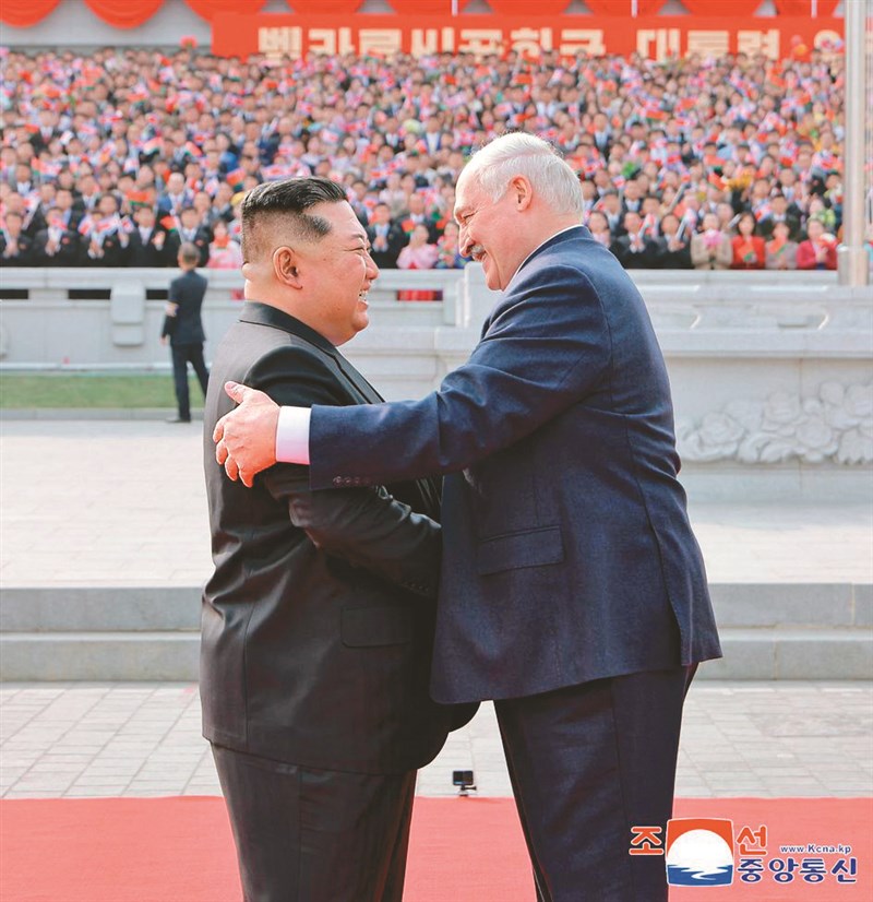 白俄羅斯總統盧卡森科(右)25日首度訪問平壤,受到北韓領導人金正恩(左)熱情迎接。圖/法新社