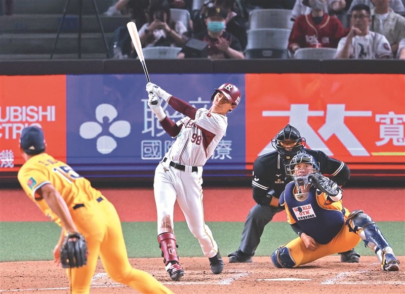 中華職棒37年開幕戰28日在台北大巨蛋舉行,8局下,樂天桃猿打者陳晨威(中)敲出右外野方向陽春砲,助隊於8局追成2比2平手。圖/中央社