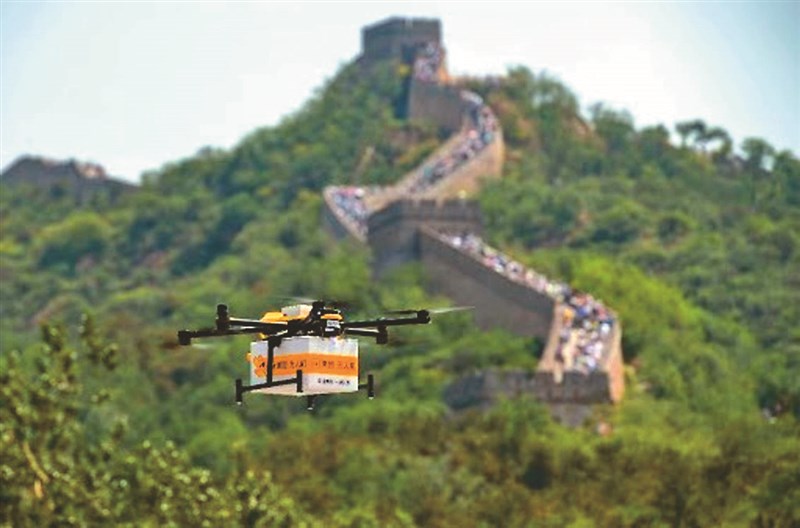 中國大陸北京市以「首都低空安全面臨挑戰」為由,全面管制無人機。圖為美團無人機運送商品至八達嶺長城。圖/取自人民網微博