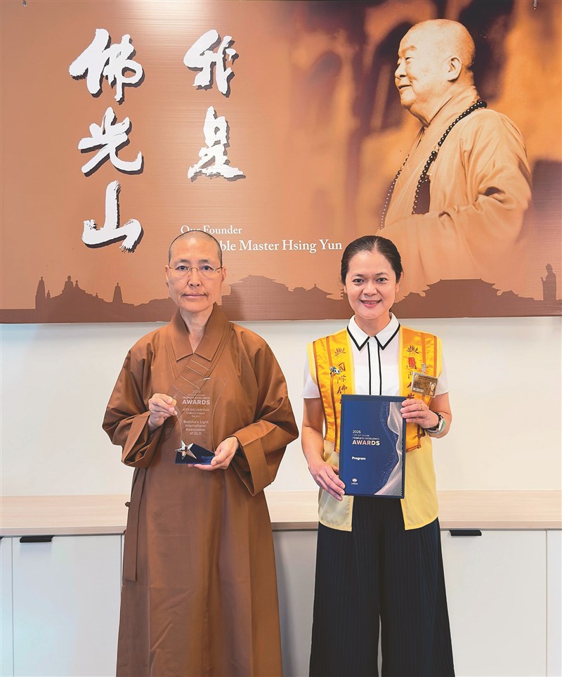 中天寺住持滿望法師(左)和昆士蘭協會長羅淑灃將「文化影響力獎」,敬獻佛光山開山祖師星雲大師。圖/人間社記者樸理