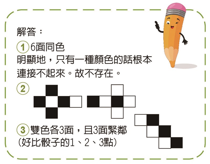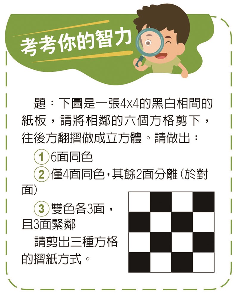 【考考你的智力】 |2026.03.30 語音朗讀 136觀看次 字級 大 中 小 考考你的智力考考你的智力 題:下圖是一張4x4的黑白相間的紙板,請將相鄰的六個方格剪下,往後方翻摺做成立方體。請做出:1.6面同色2.僅4面同色,其餘2面分離(於對面)3.雙色各3面,且3面緊鄰請剪出三種方格的摺紙方式。解答:1.6面同色明顯地,只有一種顏色的話根本連接不起來。故不存在。3.雙色各3面,且3面緊鄰(好比骰子的1、2、3點) 前一篇文章 百變女王—鹽 下一篇文章 熱門新聞 01故宮特展神獸再現 麒麟、鳳凰登場 2026.03.2402【詩】白花鬼2026.03.2503南華大學茶禪雅集 靜坐書寫時光膠囊2026.03.2604星雲大師靈骨分燈歐洲 傳燈萬方2026.03.2605佛光山365日越文版 贈西貢日航大酒店2026.03.2706星雲大師靈骨分燈北美 法脈永傳2026.03.2407紅綠葡萄抗氧化抗發炎 連皮吃獲取健康全效益2026.03.2708中南部水庫水位告急 各地農損頻傳2026.03.2409台灣工藝3專書 呈現文化獨特樣貌2026.03.2710兒童節禮物 新北學生自己票選2026.03.26 訂閱電子報 台北市 天氣預報 台灣一週天氣預報 相關報導 百變女王—鹽冰晶.雪花舞台燈光設備介紹照明工具 原理與演進茶起源 從神話到歷史來一點兒茶素嗎?